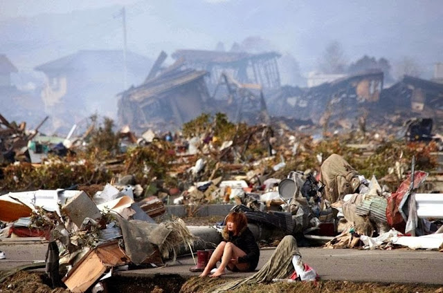 29. A woman sits amidst the wreckage caused by a massive earthquake and ensuing tsunam, in Natori, northern Japan, in March 2011